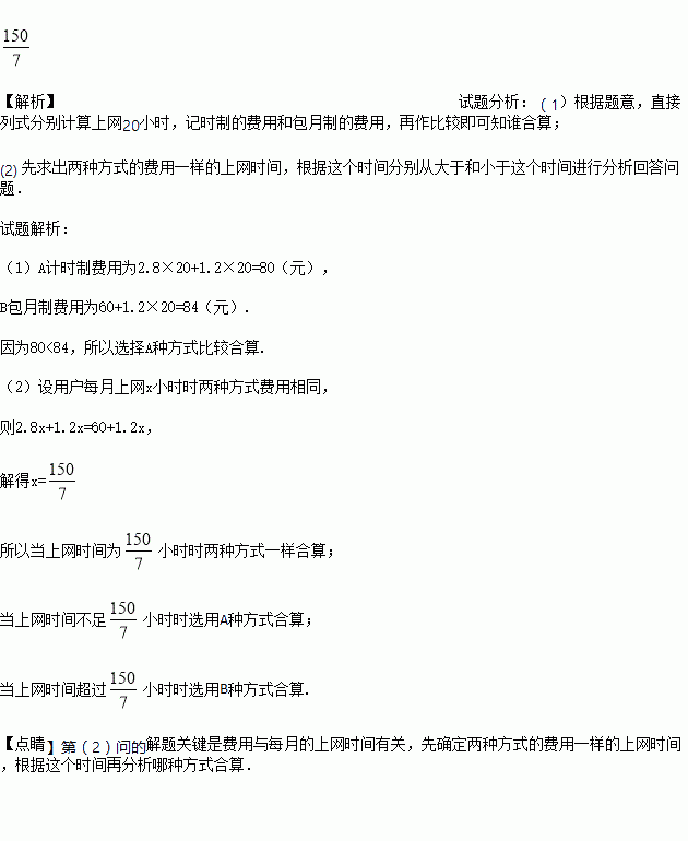 (1)某用户每月上网20小时,选用哪种收费方式比较合算?