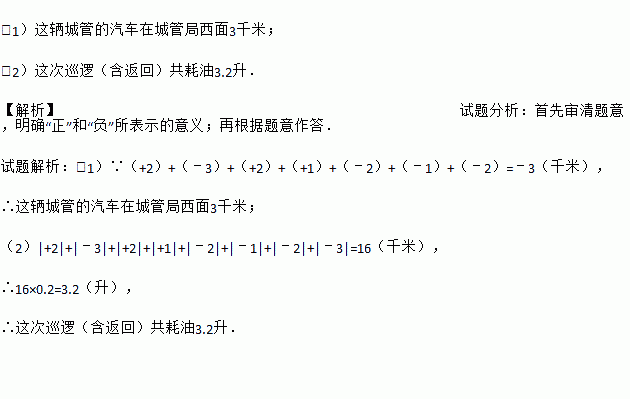 (1)这辆城管的汽车在城管局西面3千米; (2)这次巡逻(含返回)共耗油3.2升. 【解析】试题分析:首先审清题意,明确“正”和“负”所表示的意义;再根据题意作答. 试题解析:(1)∵(+2)+(﹣3)+(+2)+(+1)+(﹣2)+(﹣1)+(﹣2)=﹣3(千米), ∴这辆城管的汽车在城管局西面3千米; (2)|+2|+|﹣3|+|+2|+|+1|+|﹣2|+|﹣1...