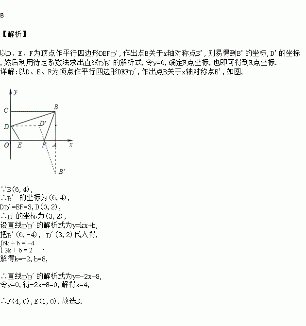 在平面直角坐标系中,矩形OABC如图所示.点A在x轴正半轴上,点C在y轴正半轴上,且OA=6,OC=4,D为OC中点,点E、F在线段OA上,点E在点F左侧,EF=3.当四边形BDEF的周长最小时,点E的坐标是( )