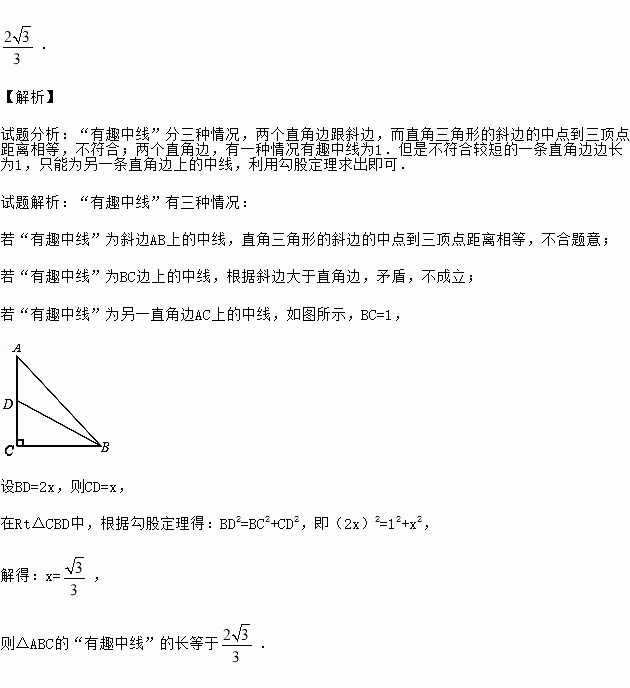 如果三角形有一边上的中线恰好等于这边的长,那么称这个三角形为“有趣三角形”,这条中线称为“有趣中线”。如图,在三角形ABC中,∠C=90°,较短的一条直角边BC=1,且三角形ABC是“有趣三角形”,求三角形ABC的“有趣中线”的长。
