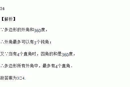 多边形所有外角中,最多有_____个钝角,_____个直角.