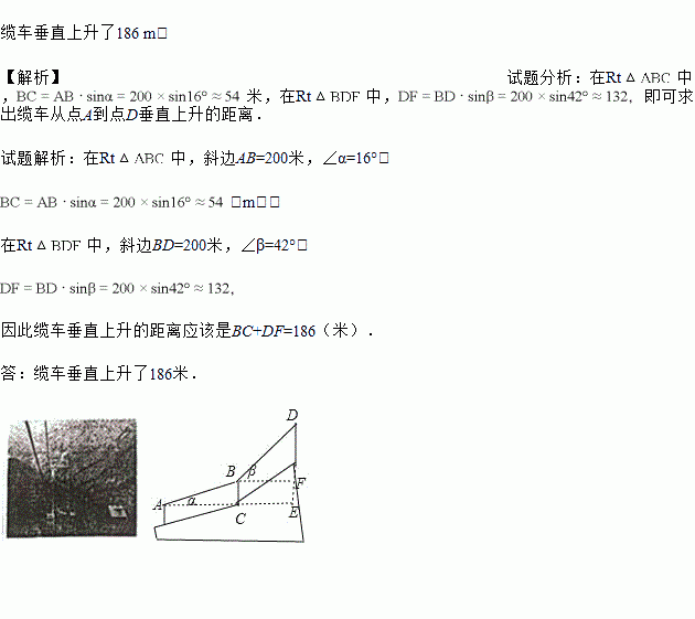 如图,小明到青城山游玩,乘坐缆车,当登山缆车的吊箱经过点A到达点B时,它经过了200 m,缆车行驶的路线与水平夹角∠α=16°,当缆车继续由点B到达点D时,它又走过了200 m,缆车由点B到点D的行驶路线与水平夹角∠β=42°,求缆车从点A到点D垂直上升的距离.(结果保留整数)(参考数据:sin16°≈0.27,cos16°≈0.77,sin42°≈0.66,cos42°≈0.74)