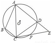 (2016山东省聊城市)如图,四边形ABCD内接于⊙O,F是上一点,且,连接CF并延长交AD的延长线于点E,连接AC.若∠ABC=105°,∠BAC=25°,则∠E的度数为( )