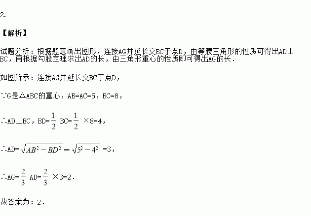 已知点G是△ABC的重心,AB=AC=5,BC=8,那么AG=_____。