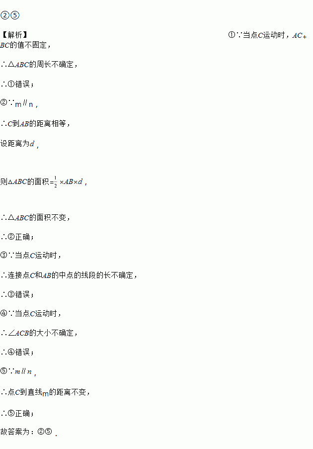 如图,A、B是直线m上两个定点,C是直线n上一个动点,且m∥n.以下说法: