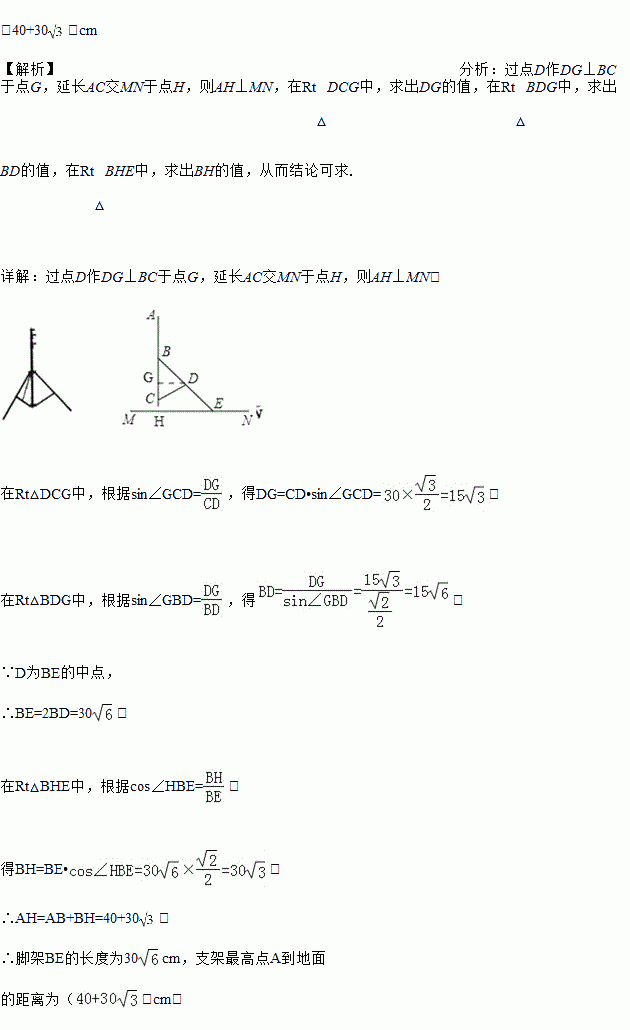 某数码产品专卖店的一块摄像机支架如图所示,将该支架打开立于地面MN上,主杆AC与地面垂直,调节支架使得脚架BE与主杆AC的夹角∠CBE=45°,这时支架CD与主杆AC的夹角∠BCD恰好等于60°,若主杆最高点A到调节旋钮B的距离为40cm.支架CD的长度为30cm,旋转钮D是脚架BE的中点,求脚架BE的长度和支架最高点A到地面的距离.(结果保留根号)