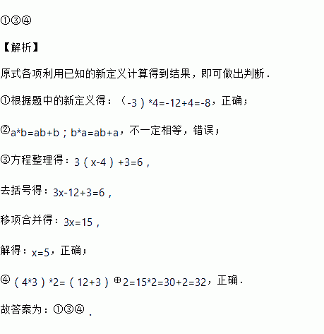 对于有理数a,b,规定一种新运算*:a*b=ab+b.例如:2*3=2×3+3=9.有下列结论:①(-3)*4=-8;②a*b=b*a;③方程(x-4)*3=6的解为x=5; ④(4*3)*2=32.其中,正确的是_____.(填序号)