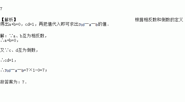 7 【解析】根据相反数和倒数的定义得出a+b=0,cd=1,再把值代入即可求出7cd―a―b的值. 【解析】 ∵a、b互为相反数, ∴a+b=0, 又∵c、d互为倒数, ∴cd=1, ∴7cd―a―b=7×1-0=7; 故答案为:7.