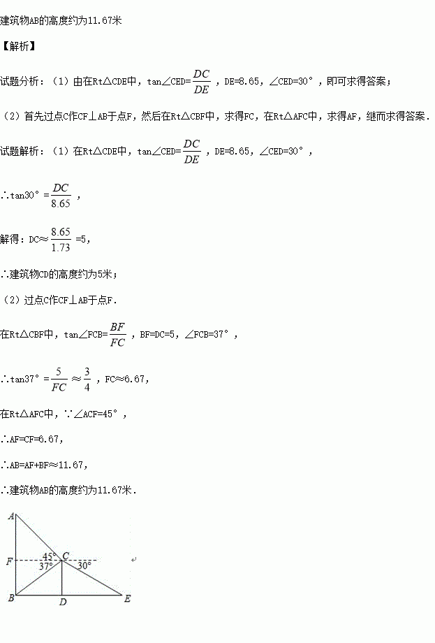 某班数学兴趣小组为了测量建筑物AB的高度,他们选取了地面上一点E,测得DE的长度为8.65米,并以建筑物CD的顶端点C为观测点,测得点A的仰角为45°,点B的俯角为37°,点E的俯角为30°.