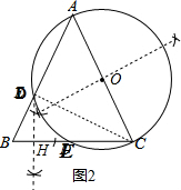 (2)作AC的垂直平分线得到点O,再以AC为直径作⊙0,如图2,过点D作DH⊥BC于H,连结CE,根据等腰三角形的性质得∠B=∠ACB,再根据圆周角定理得∠AEC=90°,则可在Rt△BCD中利用正弦可计算出CD═$\frac{16\sqrt{5}}{5}$,利用勾股定理计算出BD=$\frac{8\sqrt{5}}{5}$,然后在Rt△BHD中,根据∠B的正弦可计算出DH.