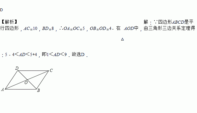 平行四边形ABCD中,对角线AC,BD交于点O,AC=10,BD=8,则AD的取值范围是( )