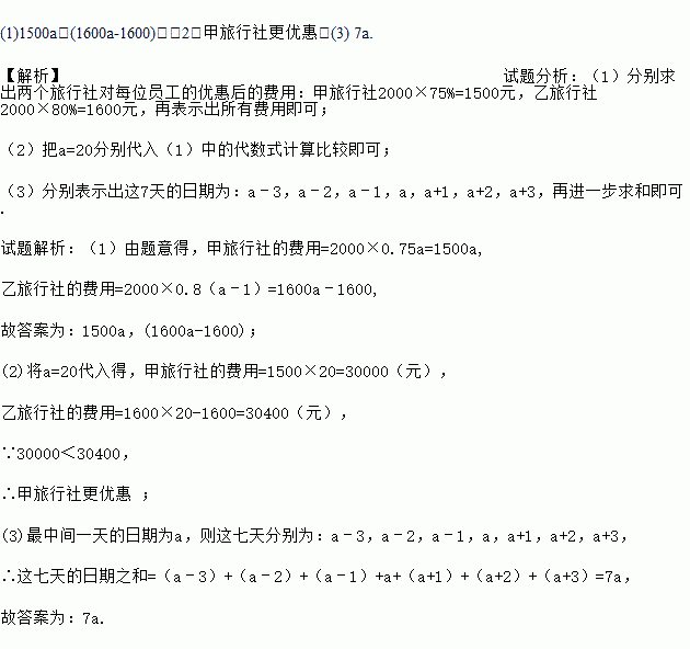 (1)1500a,(1600a-1600);(2)甲旅行社更优惠;(3) 7a. 【解析】试题分析:(1)分别求出两个旅行社对每位员工的优惠后的费用:甲旅行社2000×75%=1500元,乙旅行社2000×80%=1600元,再表示出所有费用即可; (2)把a=20分别代入(1)中的代数式计算比较即可; (3)分别表示出这7天的日期为:a﹣3,a﹣2,a﹣1,a,a+1,a+2,...