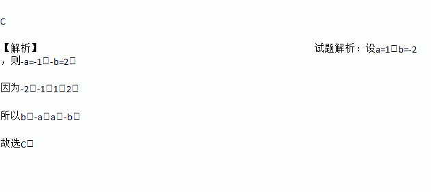 C 【解析】试题解析:设a=1,b=-2,则-a=-1,-b=2, 因为-2<-1<1<2, 所以b<-a<a<-b. 故选C.