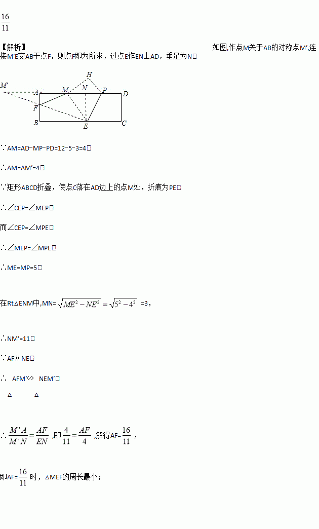 如图,在矩形纸片ABCD中,AB=4,AD=12,将矩形纸片折叠,使点C落在AD边上的点M处,折痕为PE,此时PD=3.在AB边上有一个动点F,且不与点A,B重合.当AF=______时,△MEF的周长最小。