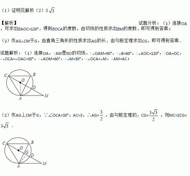 如图,在△ABC中,∠B=60°,⊙O是△ABC的外接圆,过点A作⊙O的切线,交CO的延长线于点M,CM交⊙O于点D.
