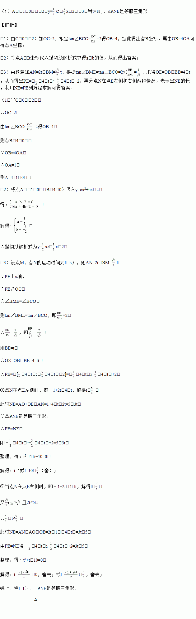 个单位的速度向点C运动,同时点N从点A出发以每秒2个单位的速度向点B运动,当点M、N中的一点到达终点时,两点同时停止运动.过点M作MP⊥x轴于点E,交抛物线于点P.设点M、点N的运动时间为t(s),当t为多少时,△PNE是等腰三角形?