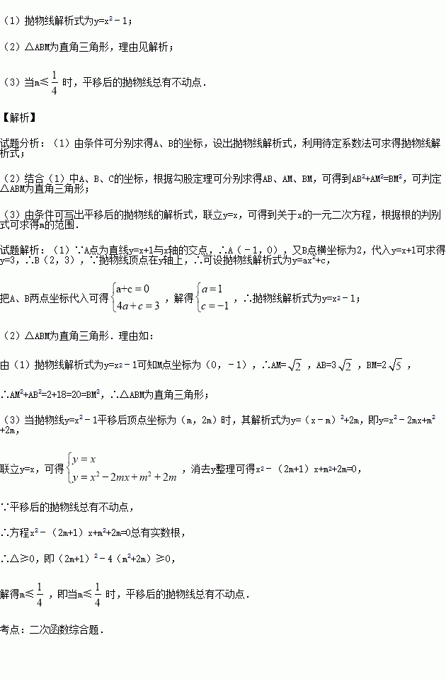 (3)把抛物线与直线y=x的交点称为抛物线的不动点.若将(1)中抛物线平移,使其顶点为(m,2m),当m满足什么条件时,平移后的抛物线总有不动点.
