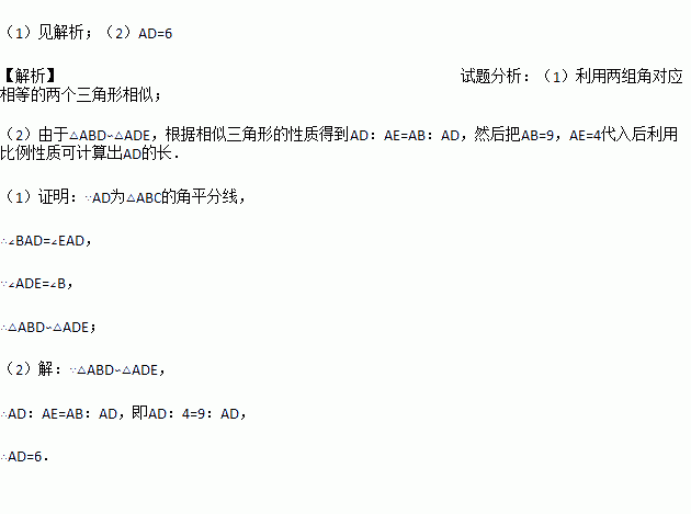 (1)求证:△ABD∽△ADE。 (2)若AB =9,AE=4求AD的长。
