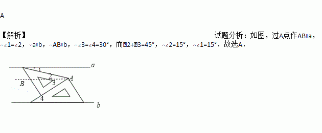 将一副三角板和一张对边平行的纸条按如图摆放,两个三角板的一直角边重合,含30°角的直角三角板的斜边与纸条一边重合,含45°角的三角板的一个顶点在纸条的另一边上,则∠1的度数是( )
