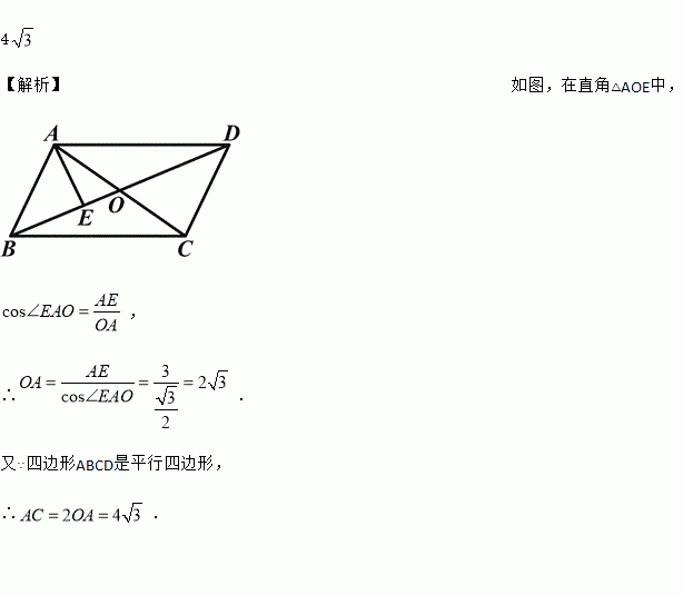 如图,□ABCD中,AE⊥BD于E,∠EAC=30°,AE=3,则AC的长等于_______.