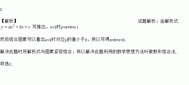 C 【解析】试题解析:由解析式可推出,x=1时y=a+b+c; 然后结合图象可以看出x=1时对应y的值小于0,所以可得a+b+c<0. 解决此题时将解析式与图象紧密结合,所以解决此题利用的数学思想方法叫做数形结合法. 故选C.