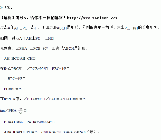 如图,一个热气球悬停在空中,从热气球上的P点测得直立于地面的旗杆AB的顶端A与底端B的俯角分别为34°和45°,此时P点距地面高度PC为75米,求旗杆AB的高度(结果精确到0.1米).