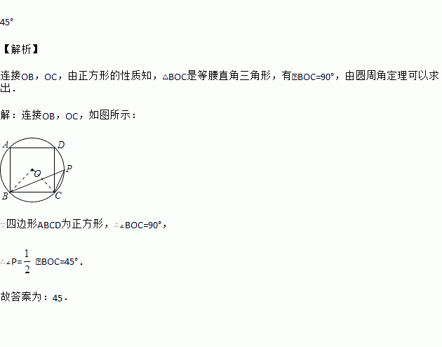 如图,正方形ABCD是⊙O的内接正方形,点P是劣弧AB上不同于点B的任意一点,则∠BPC的度数为_____°.