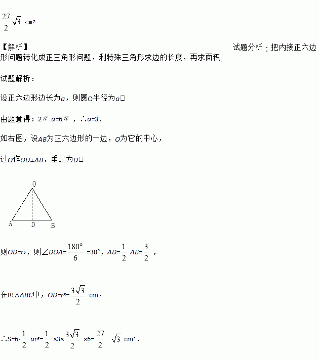 如图所示,已知⊙O的周长等于6cm,求以它的半径为边长的正六边形ABCDEF的面积.