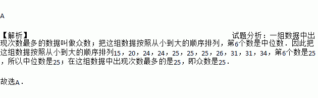 A 【解析】试题分析:一组数据中出现次数最多的数据叫做众数;把这组数据按照从小到大的顺序排列,第6个数是中位数.因此把这组数据按照从小到大的顺序排列15,20,24,24,25,25,25,26,31,31,34,第6个数是25,所以中位数是25;在这组数据中出现次数最多的是25,即众数是25. 故选A.