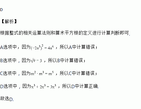 A. (﹣2a3)2=﹣4a6 B. =±3 C. m2•m3=m6 D. x3+2x3=3x3