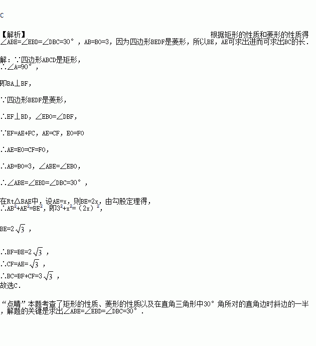 如图,在矩形ABCD中,边AB的长为3,点E,F分别在AD,BC上,连接BE,DF,EF,BD,若四边形BEDF是菱形,且EF=AE+FC,则边BC的长为( )