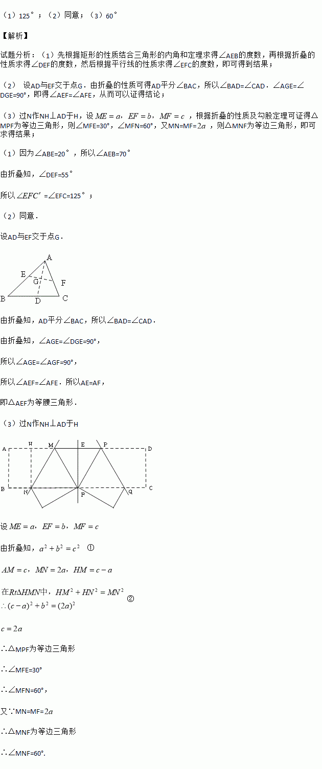 处,折痕为EF,若∠ABE=20°,那么