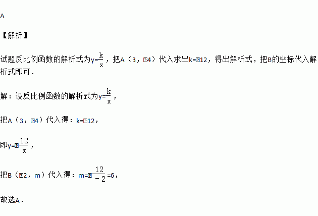 若点A(3,-4)、B(-2,m)在同一个反比例函数的图像上,则m的值为 ( )