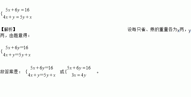 中国古代的数学专著《九章算术》有方程组问题“五只雀,六只燕,共重1斤(等于16两),雀重燕轻.互换其中一只,恰好一样重.”设每只雀、燕的重量各为x两,y两,则根据题意,可得方程组为___.