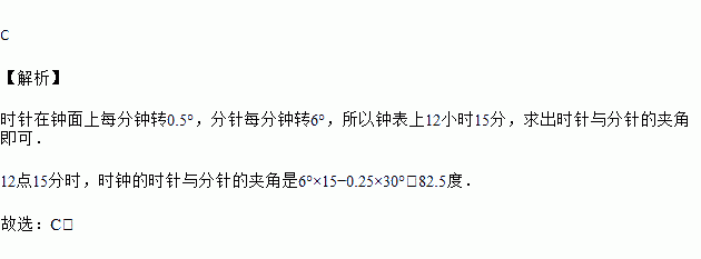 12点15分,钟表上时针与分针所成的夹角的度数为![]()