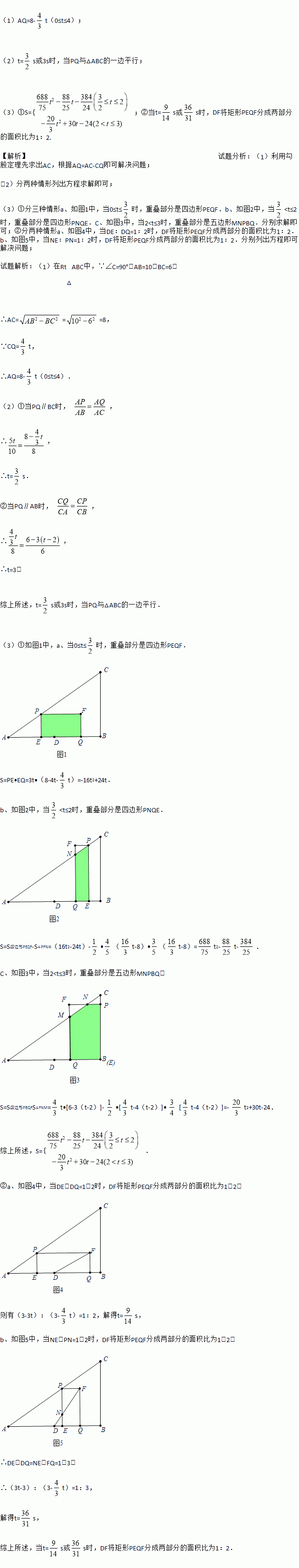 (3)如图②,过点P作PE⊥AC于点E,以PE、QE为邻边作矩形PEQF,点D为AC的中点,连结DF.直接写出DF将矩形PEQF分成两部分的面积比为1:2时t的值.