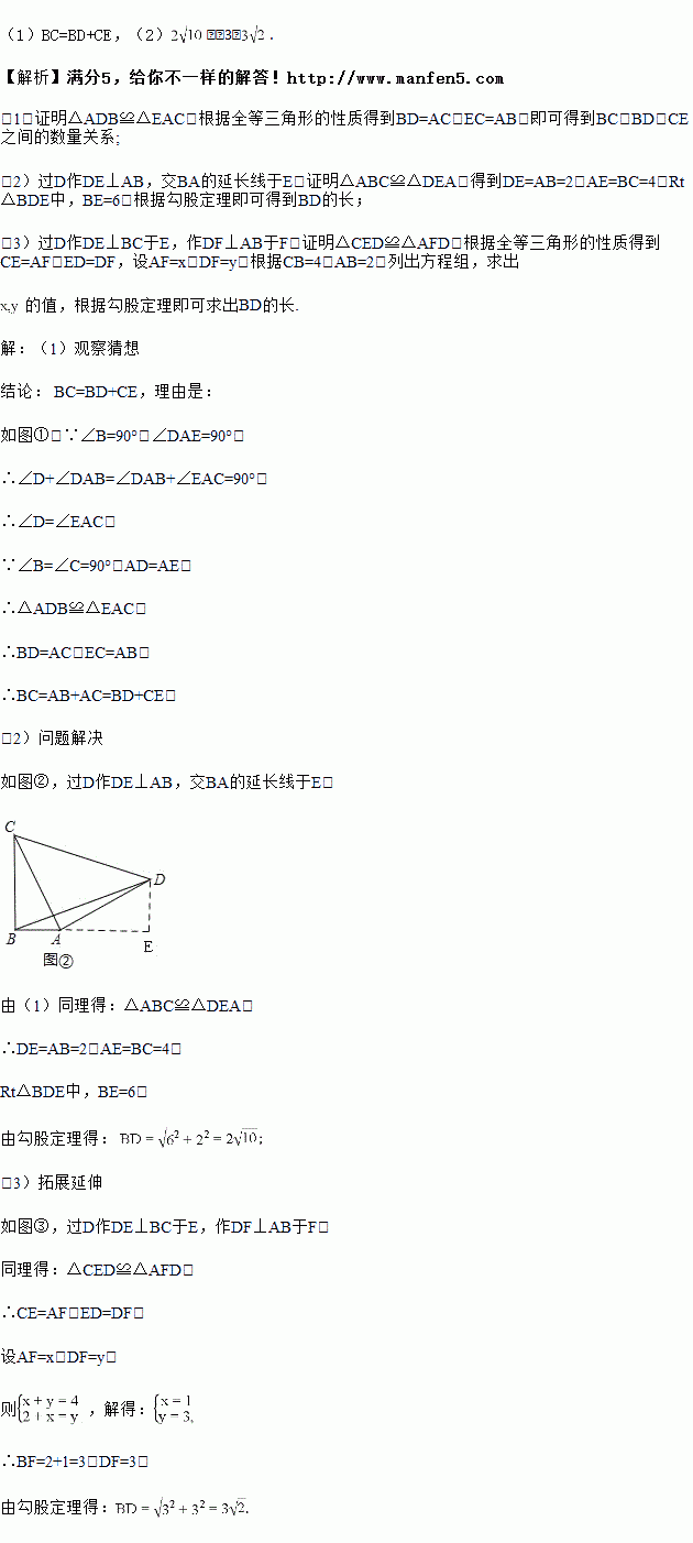 如图①点B、A、C在同一条直线上,DB⊥BC,EC⊥BC且∠DAE=90°,AD=AE,则BC、BD、CE之间的数量关系为;