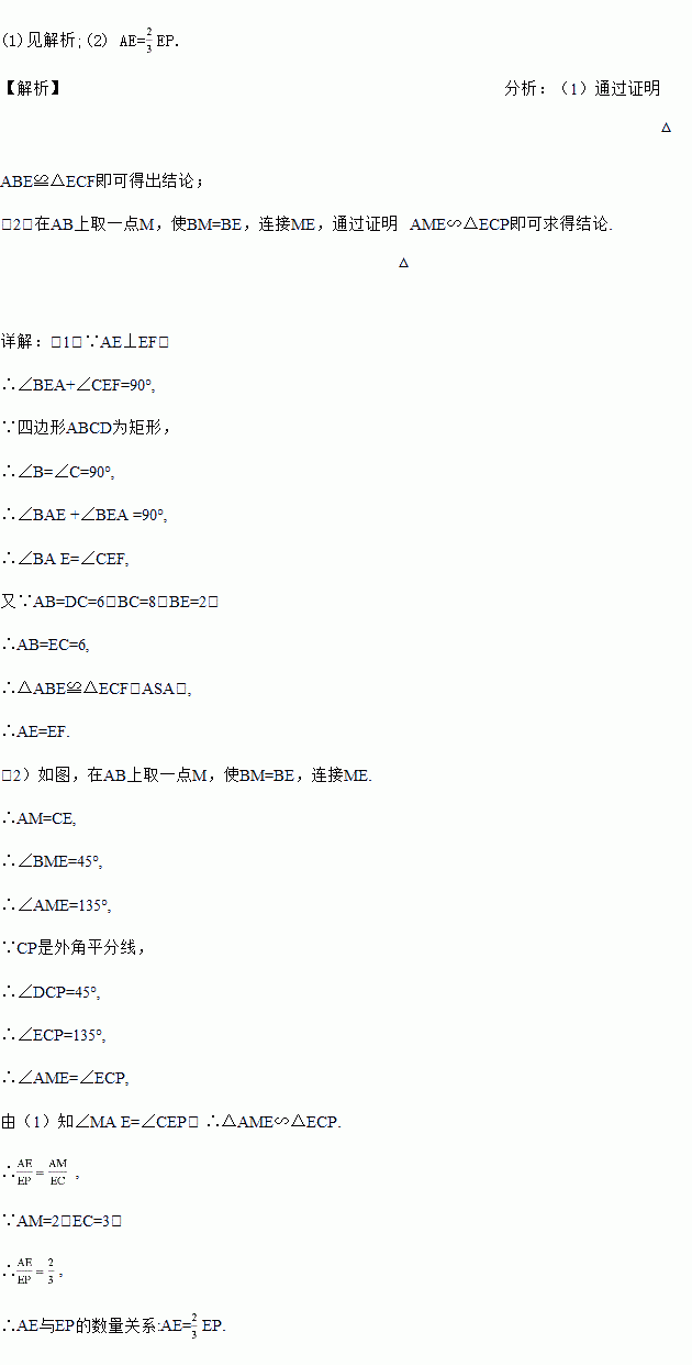 (2)延长EF交矩形∠BCD的外角平分线CP于点P(图2),试求AE与EP的数量关系;