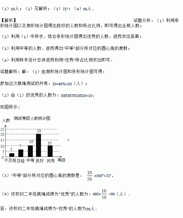 £¨4£©Èç¹û¸ÃУ³õ¶þÄê¼¶µÄ×ÜÈËÊýÊÇ480ÈË£¬¸ù¾Ý´Ëͳ¼ÆÊý¾Ý£¬ÇëÄã¹ÀËã¸ÃУ³õ¶þÄê¼¶ÌøÉþ³É¼¨Îª¡°ÓÅÐ㡱µÄÈËÊý£®