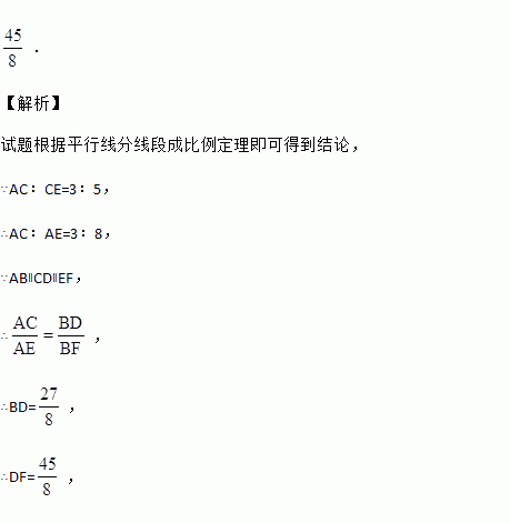 如图,已知AB∥CD∥EF,它们依次交直线l1、l2于点A、C、E和点B、D、F,如果AC:CE=3:5,BF=9,那么DF= .