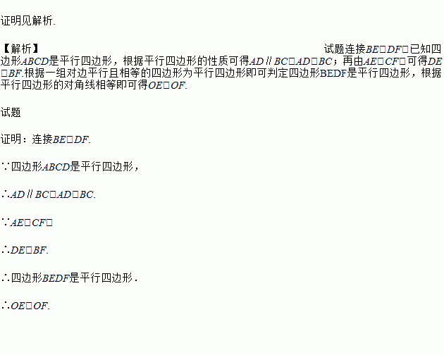 如图,在□ABCD中,点E、F分别在AD,BC上,且AE=CF,EF,BD相交于点O,求证:OE=OF.