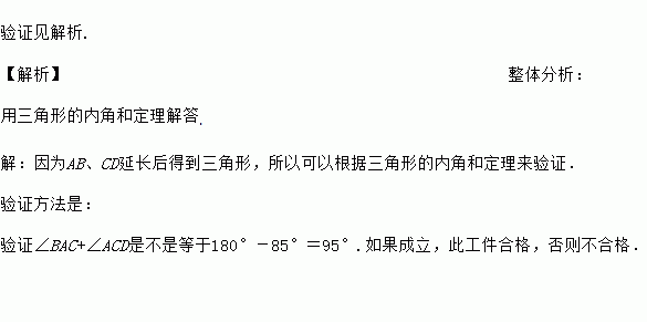如图所示,按规定,一块模板中 AB 、 CD 的延长线应相交成85°的角,因交点不在板上,不便测量.如果你是技术工人,利用你所学的知识,能否验证这个模板是否合格?请写出你的验证过程.