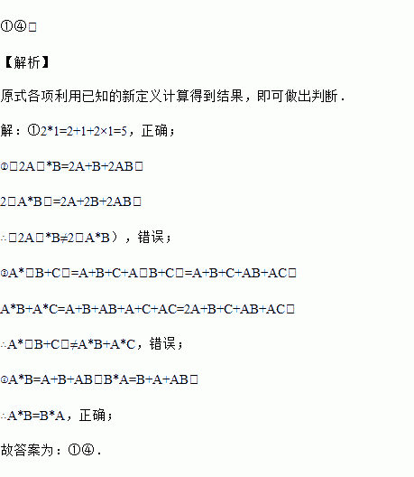 定义新运算:A*B=A+B+AB,则下列结论正确的是_____(填序号)