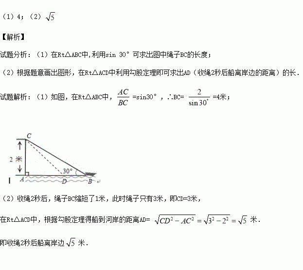 (2)收绳2秒后船离岸边多少米?(结果保留根号)