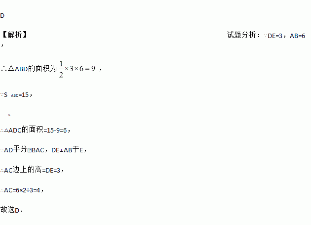 D 【解析】试题分析:∵DE=3,AB=6, ∴△ABD的面积为, ∵S△ABC=15, ∴△ADC的面积=15-9=6, ∵AD平分∠BAC,DE⊥AB于E, ∴AC边上的高=DE=3, ∴AC=6×2÷3=4, 故选D.