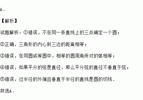 A. 【解析】 试题解析:①错误,不在同一条直线上的三点确定一个圆; ②正确,三角形的内心到三边的距离相等; ③错误,在同圆或等圆中,相等的圆周角所对的弧相等; ④错误,如果平分的弦是直径,那么平分弦的直径不垂直于弦; ⑤错误,过半径的外端且垂直于半径的直线是圆的切线. 故选A.
