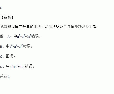 A. a5+a5=a10 B. a6×a4=a24 C. a0÷a-1 =a D. a4-a4 =a0