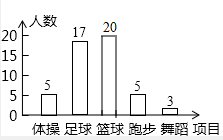 ΪÁËÁ˽âȫУ6000ÃûѧÉú¶ÔѧУÉèÖõÄÌå²Ù¡¢À¶Çò¡¢×ãÇò¡¢Åܲ½¡¢Î赸µÈ¿ÎÍâÌåÓý»î¶¯ÏîÄ¿µÄ ϲ°®Çé¿ö£¬ÔÚȫУ·¶Î§ÄÚËæ»ú³éÈ¡ÁËÈô¸ÉÃûѧÉú£®¶ÔËûÃÇ×îϲ°®µÄÌåÓýÏîÄ¿£¨Ã¿ÈËֻѡһÏ½øÐÐÁËÎʾíµ÷²é£¬½«Êý¾Ý½øÐÐÁËͳ¼Æ²¢»æÖƳÉÁËÈçͼËùʾµÄƵÊý·Ö²¼Ö±·½Í¼ºÍÉÈÐÎͳ¼ÆÍ¼£¨¾ù²»ÍêÕû£©£®