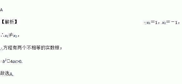 A 【解析】∵x1=1,x2=-1, ∴x1≠x2, ∴方程有两个不相等的实数根; ∴b2-4ac>0. 故选A.