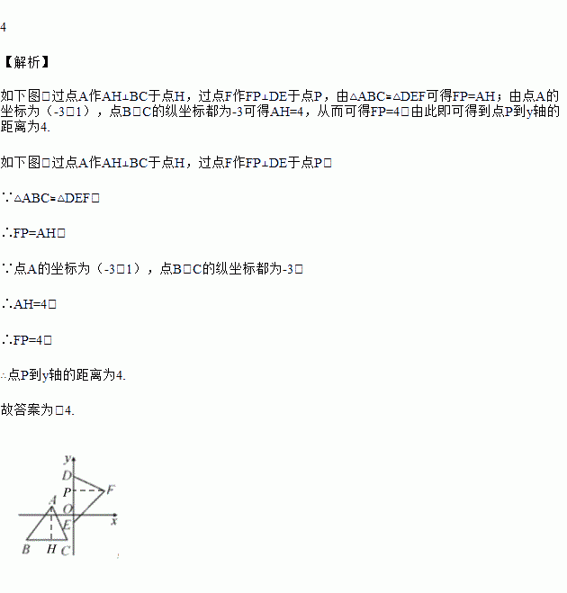 如图,坐标平面上,△ABC≌△DEF,其中A,B,C的对应顶点分别为D,E,F,且AB=BC=5.若A点的坐标为(-3,1),B,C两点的纵坐标都是-3,D,E两点在y轴上,则点F到y轴的距离为____.